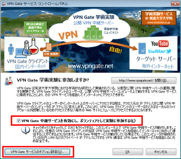 上記の「VPN Gate 中継サービスを有効にし、ボランティアとして実験に参加する」(デフォルトで